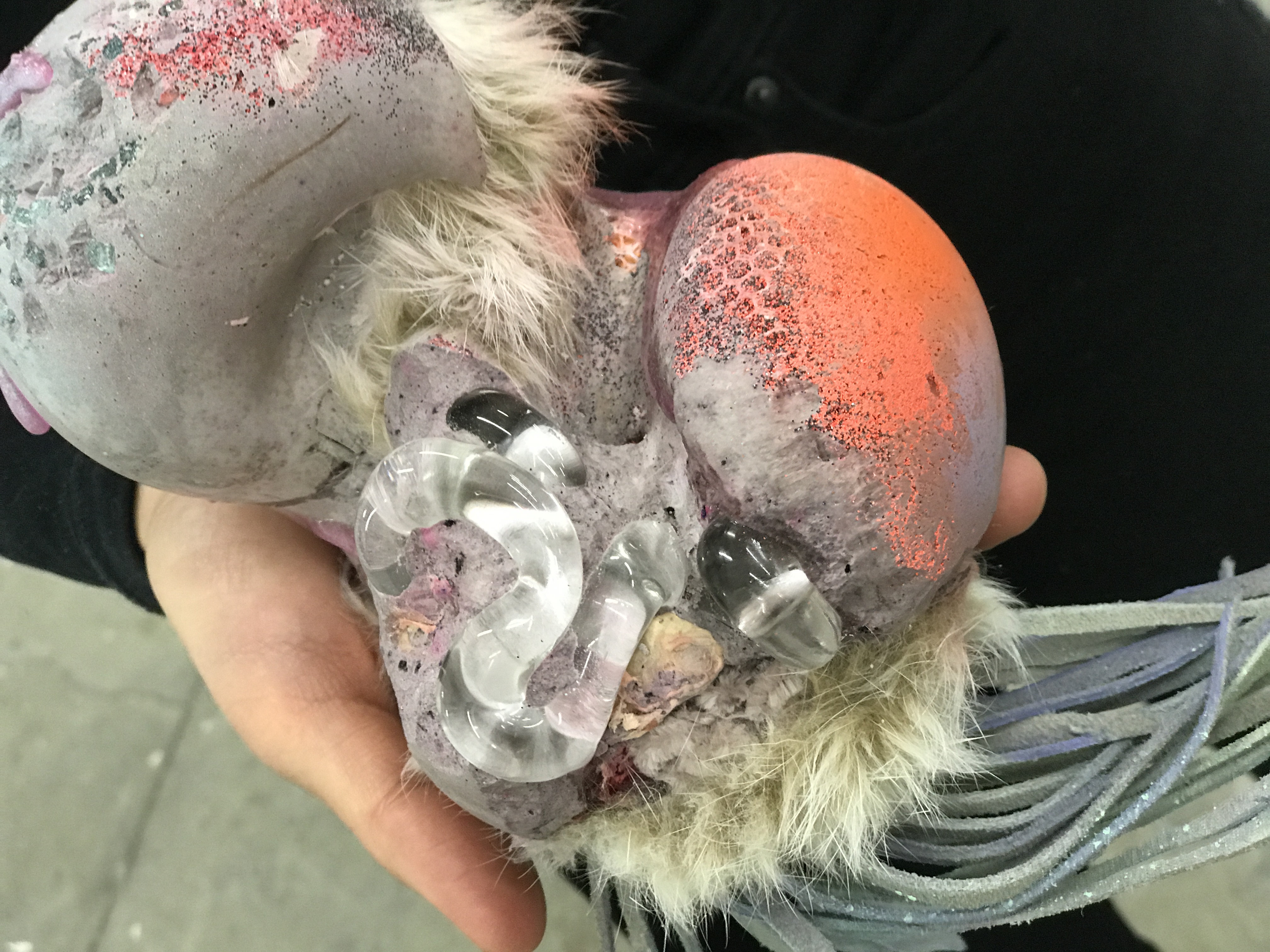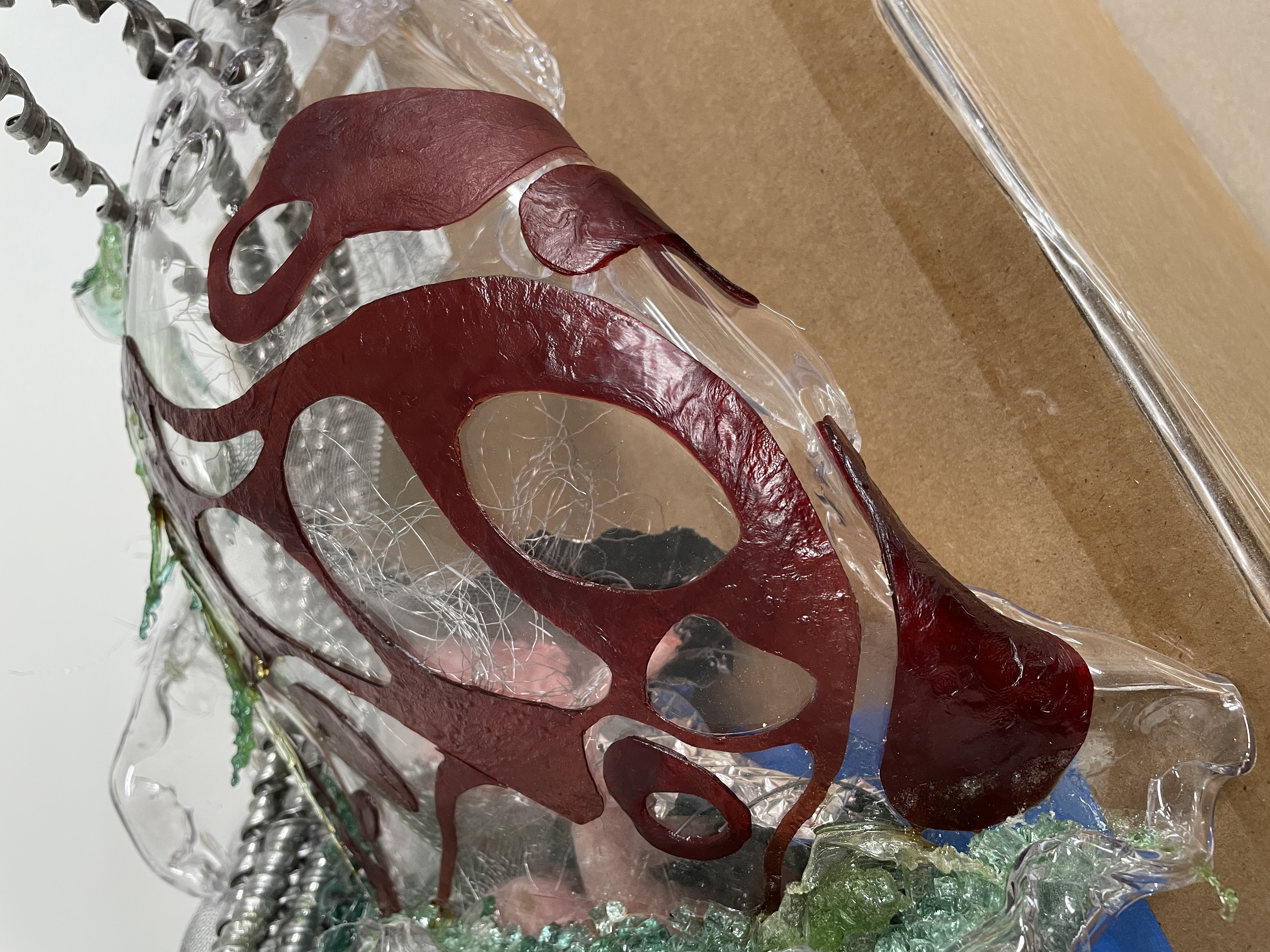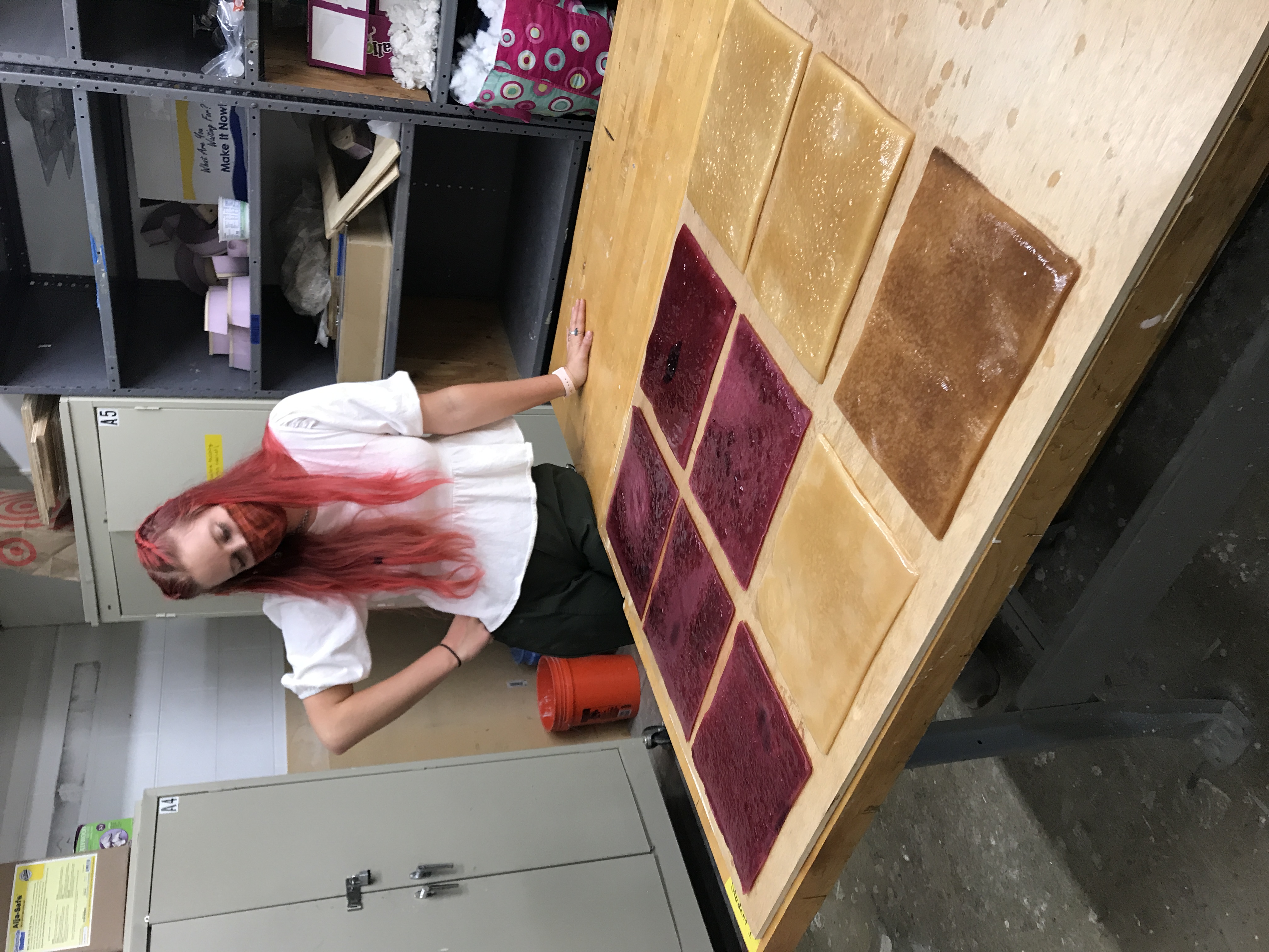 2) Bioplastic is poured, pigment and found materials are added, and bioplastic is shaped while it dries.